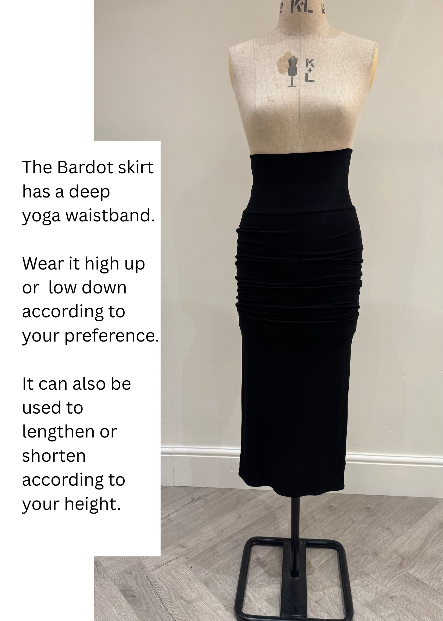 Our classic Bardot double layer jersey skirt is an essential basic in every wardrobe. It has a wide yoga waistband which smooths the stomach area and allows the length to be adjusted. The wearer can also decide whether to wear the skirt high or lower on the hips, making this a very versatile piece.