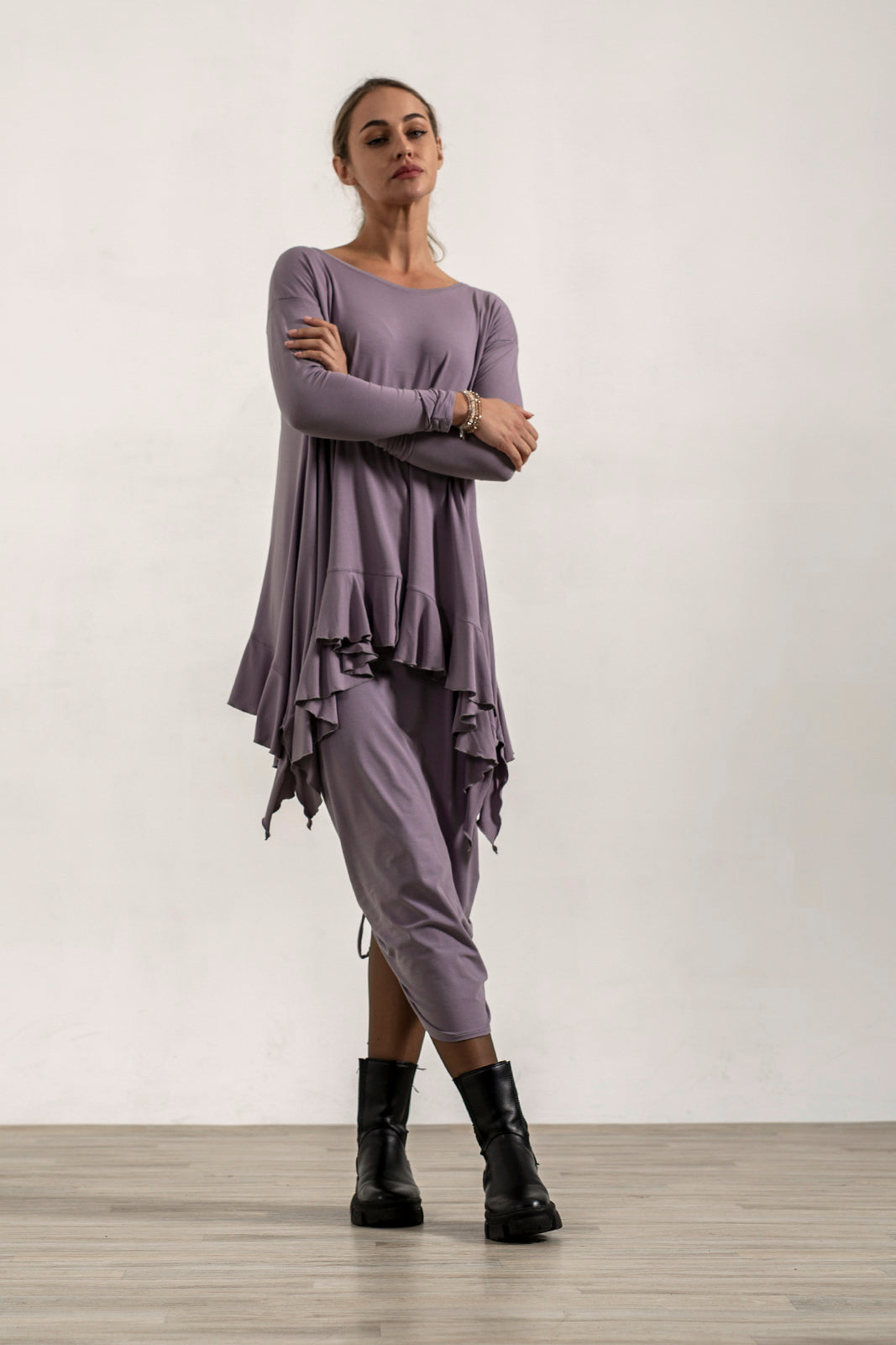 Ruche the back higher for boots, or wear long with trainers