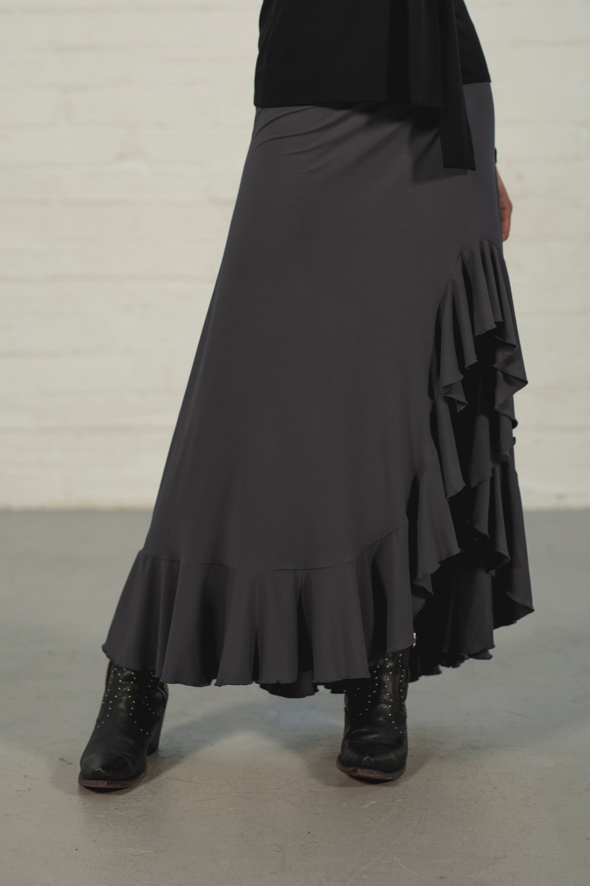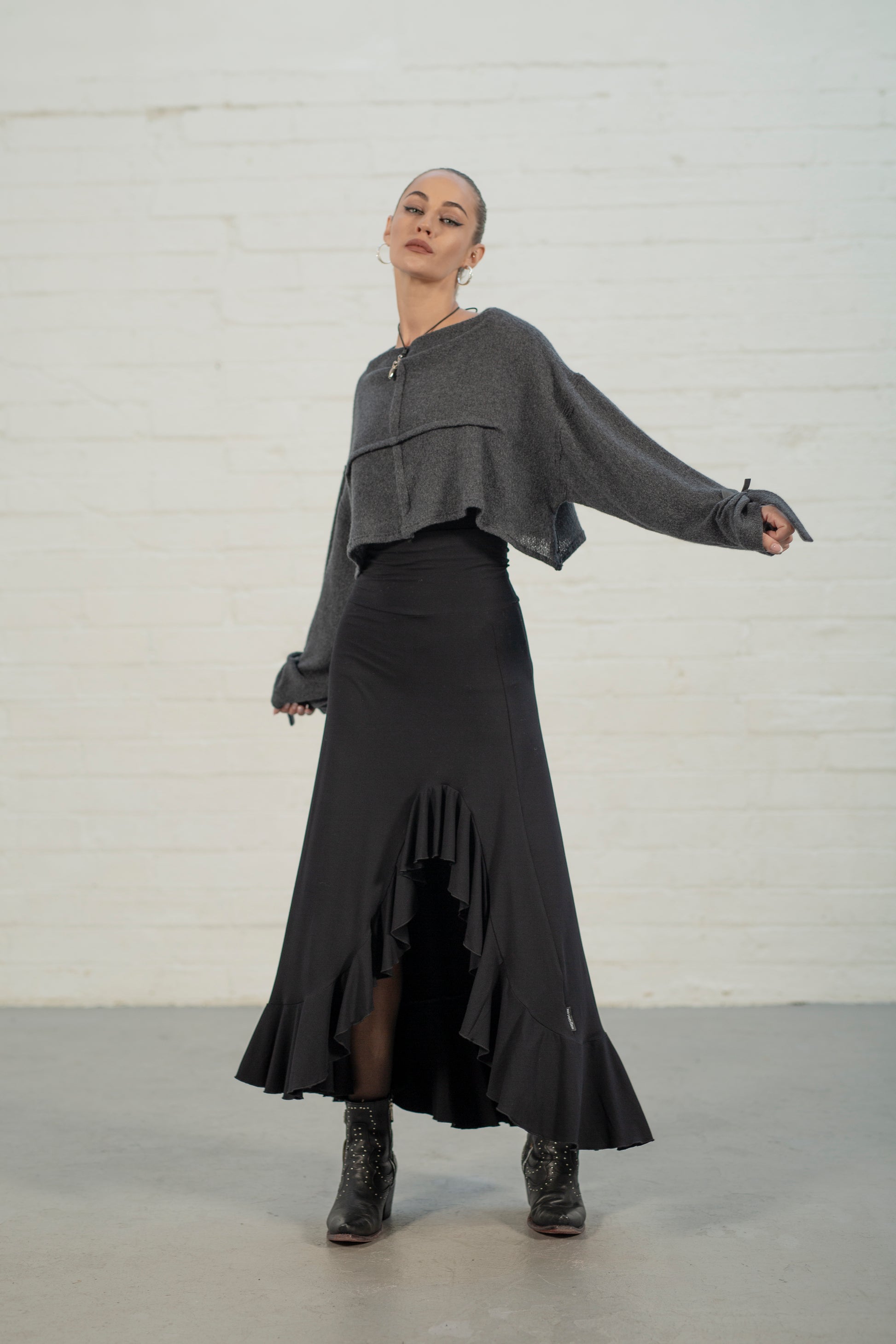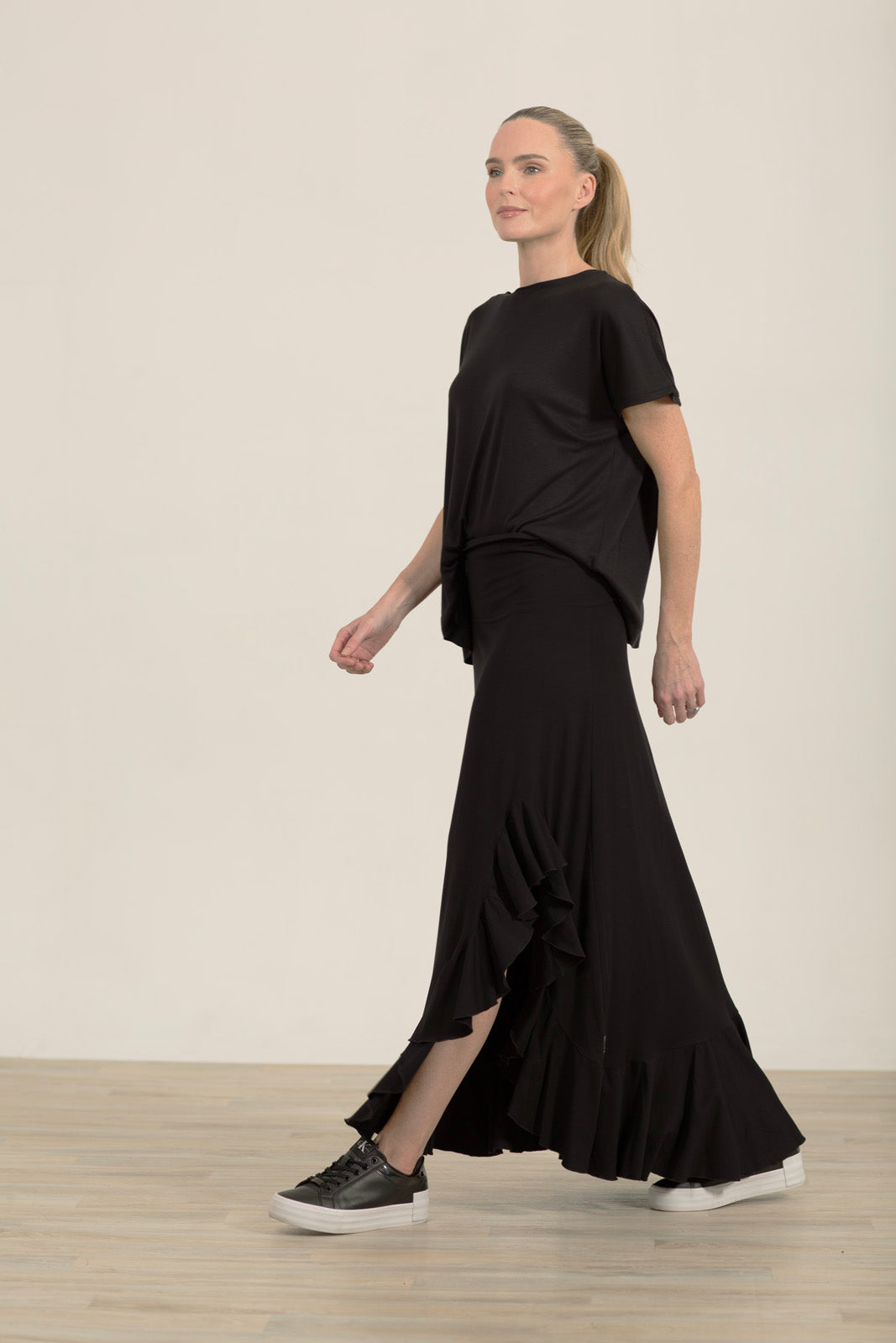 Fitted on the upper hip, the skirt flows out beautifully, with no clinging, and finishes in an asymmetrical frilled hem that gives you a perfect flash of leg. It’s ideal for pairing with opaque tights in winter for full coverage, and it works effortlessly with all of our tops this season.