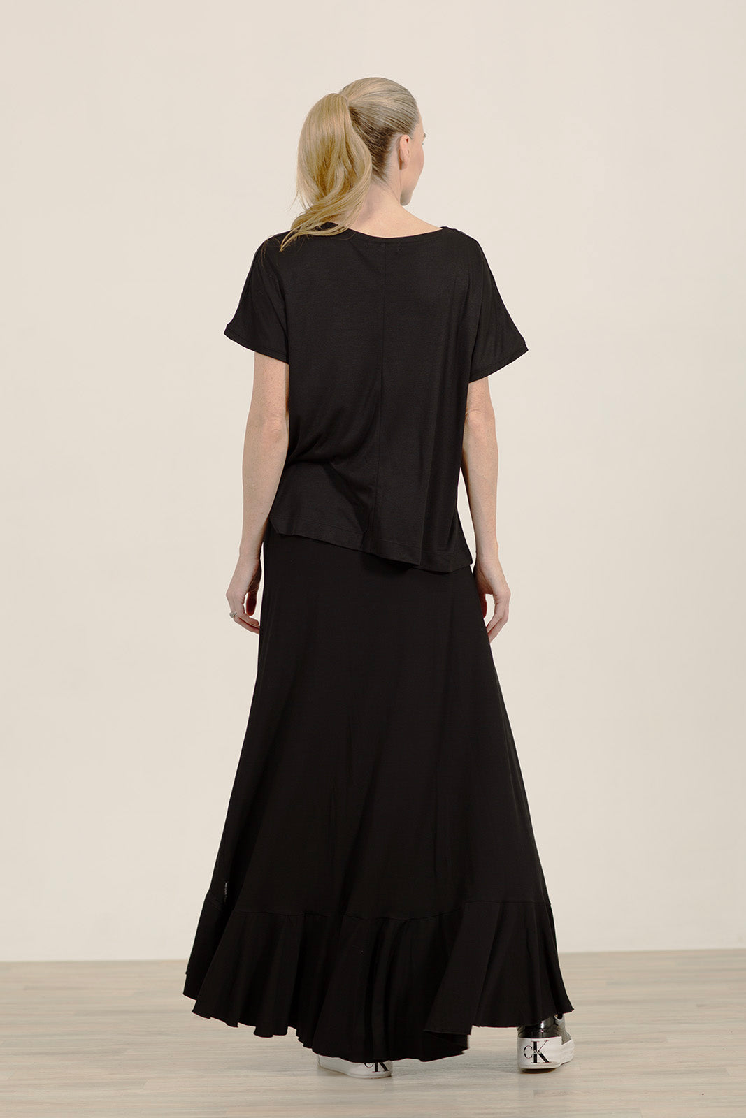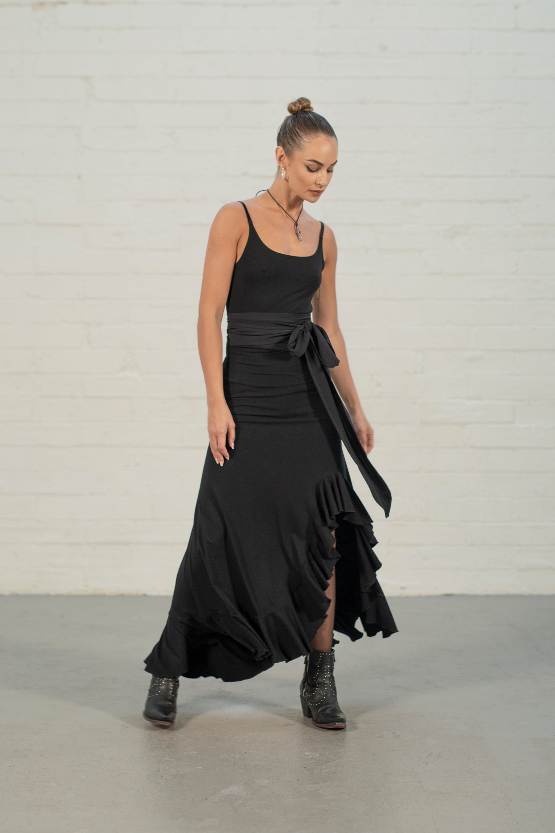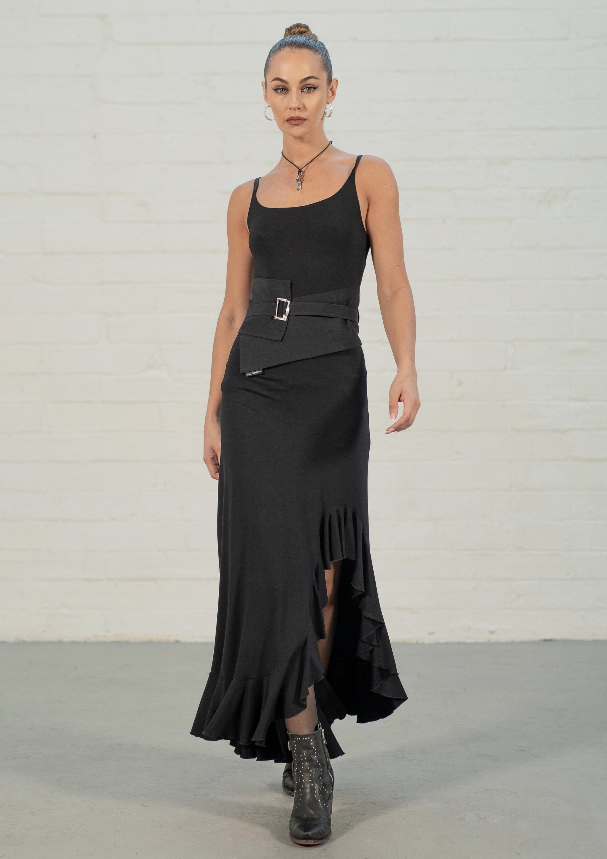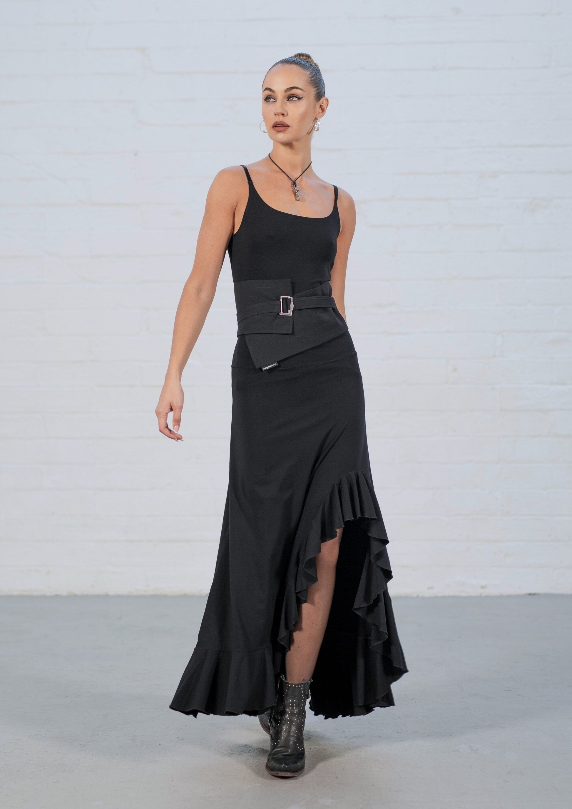Fitted on the upper hip, the skirt flows out beautifully, with no clinging, and finishes in an asymmetrical frilled hem that gives you a perfect flash of leg. It’s ideal for pairing with opaque tights in winter for full coverage, and it works effortlessly with all of our tops this season.