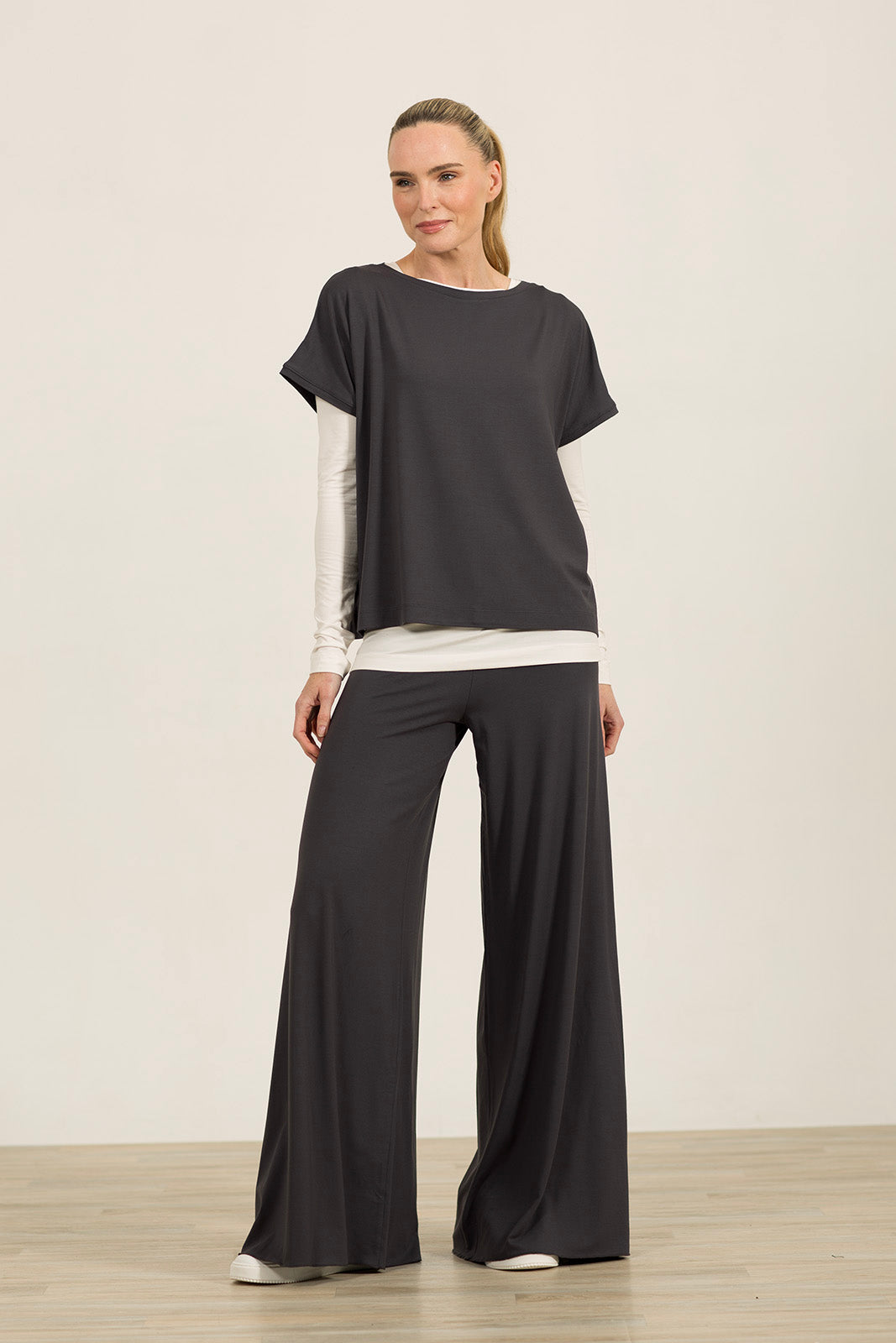 Wear it on its own or layered over a long sleeve tee. It comes to about the hip (our model is 5"10), and can be worn loose or tucked into jeans, leggings, palazzos or skirts.