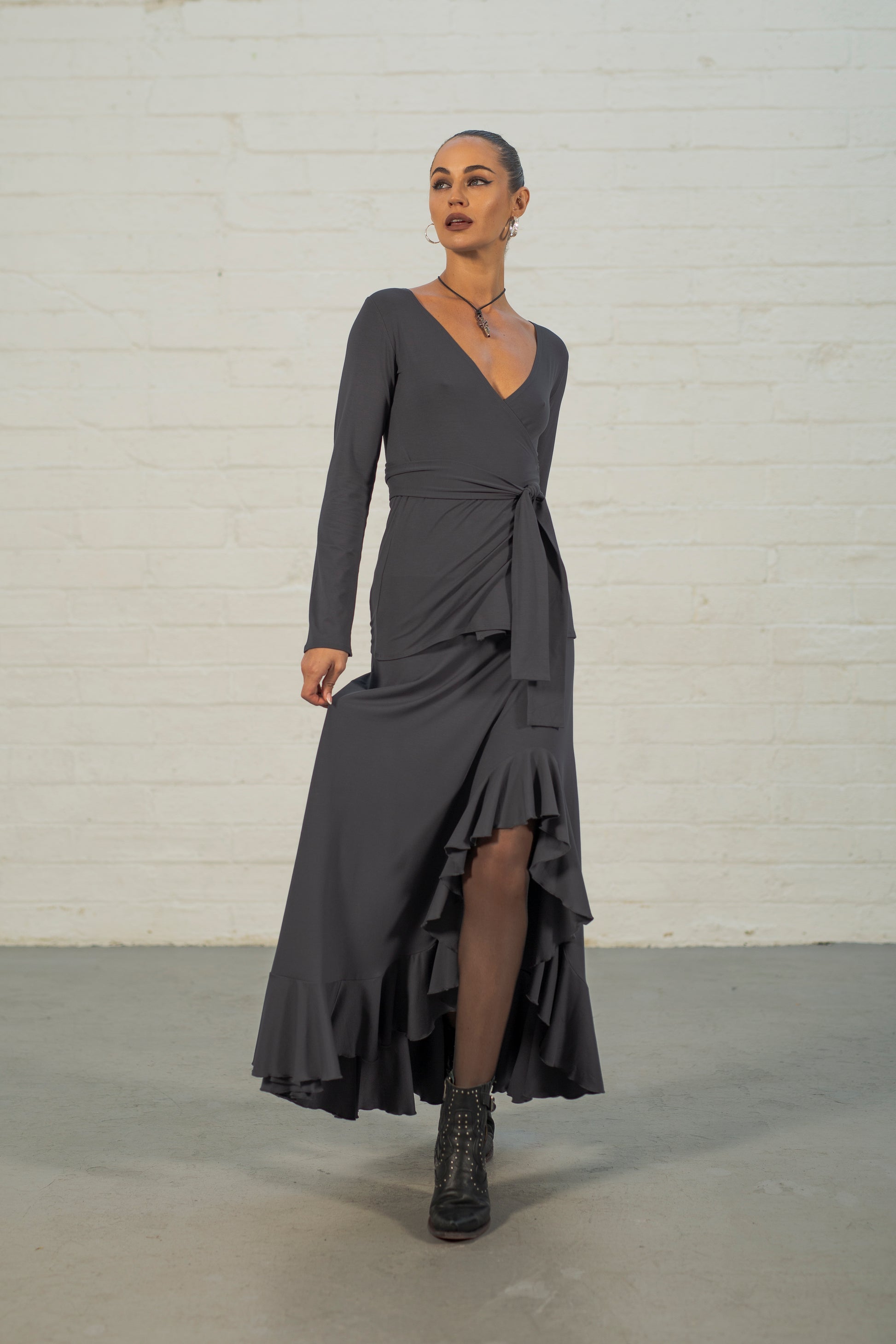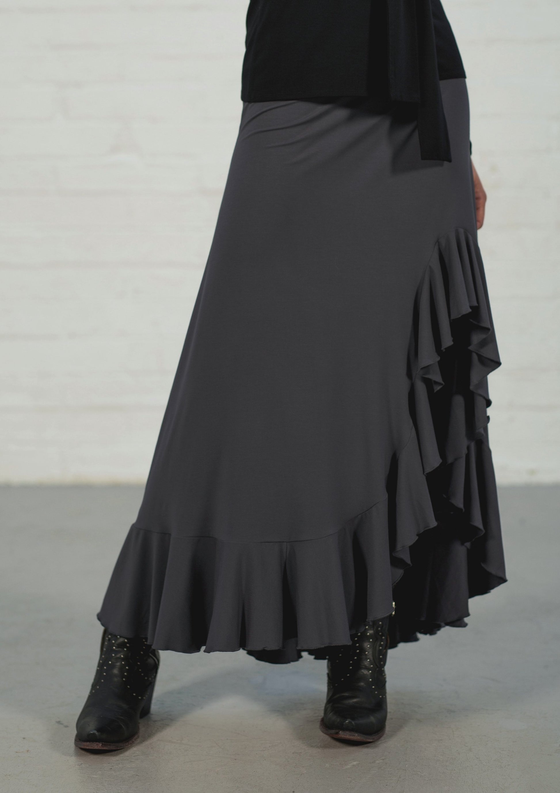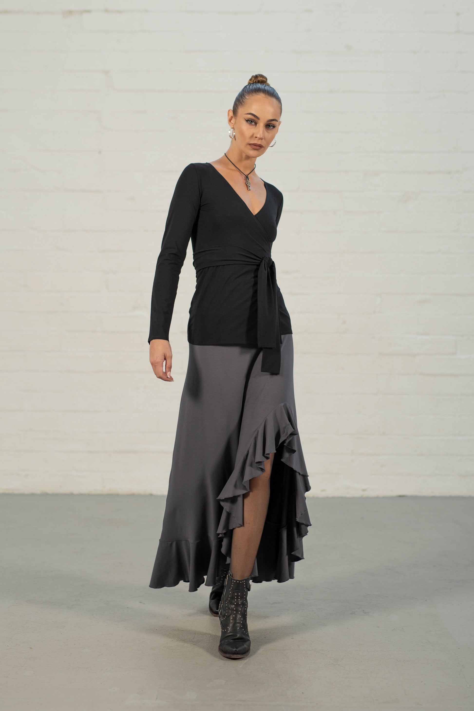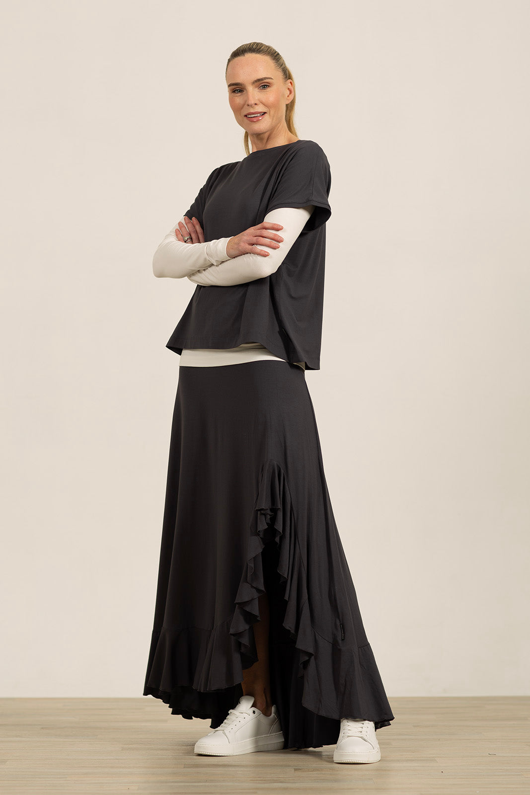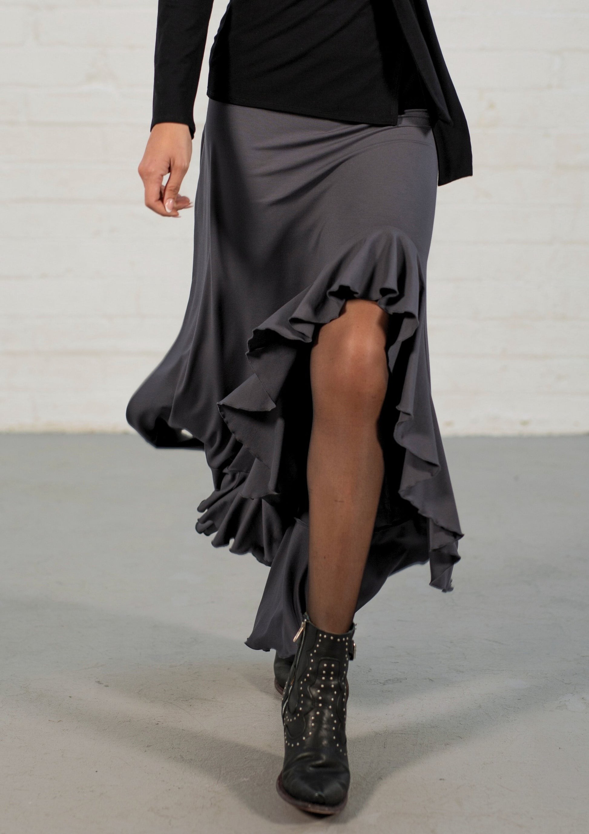 Fitted on the upper hip, the skirt flows out beautifully, with no clinging, and finishes in an asymmetrical frilled hem that gives you a perfect flash of leg. It’s ideal for pairing with opaque tights in winter for full coverage, and it works effortlessly with all of our tops this season.