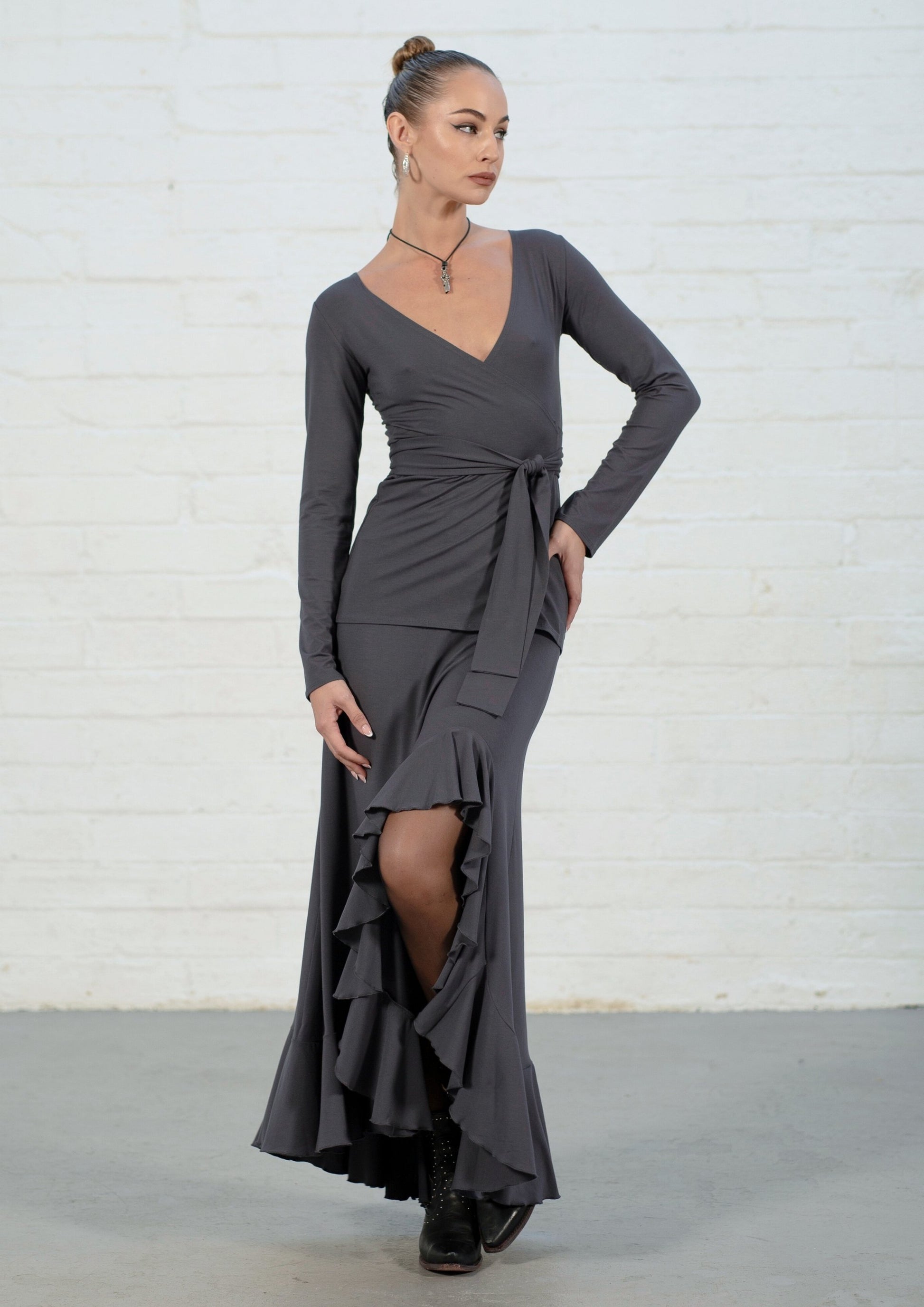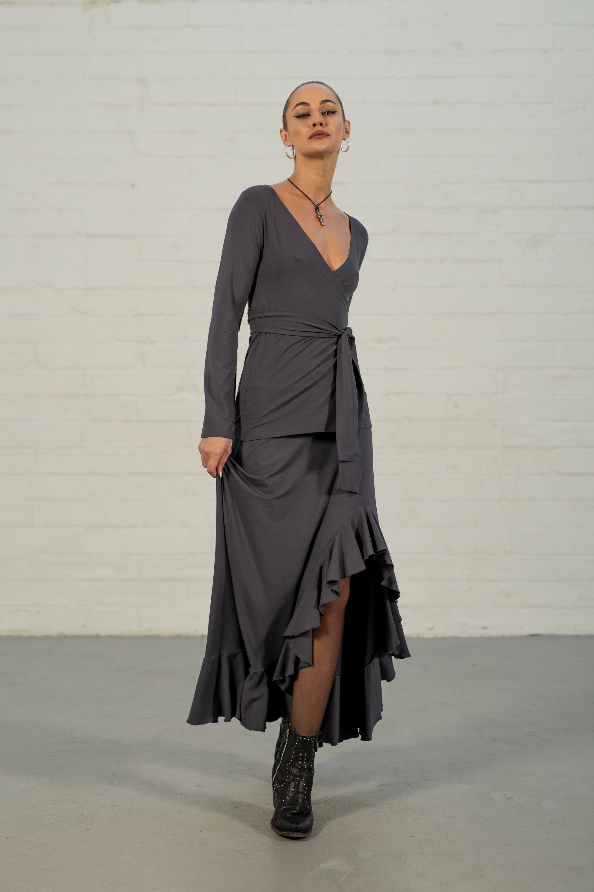 With long, fitted sleeves, this top is the epitome of elegance and grace, yet it’s designed to be worn with a healthy dose of attitude. Pair it with our Daphna skirt for that full Morticia Addams vibe, or style it with any of our other bottoms for a different look. Want a bit more coverage? Layer it with one of our jersey vests underneath, and you're ready to go from day to night with ease.