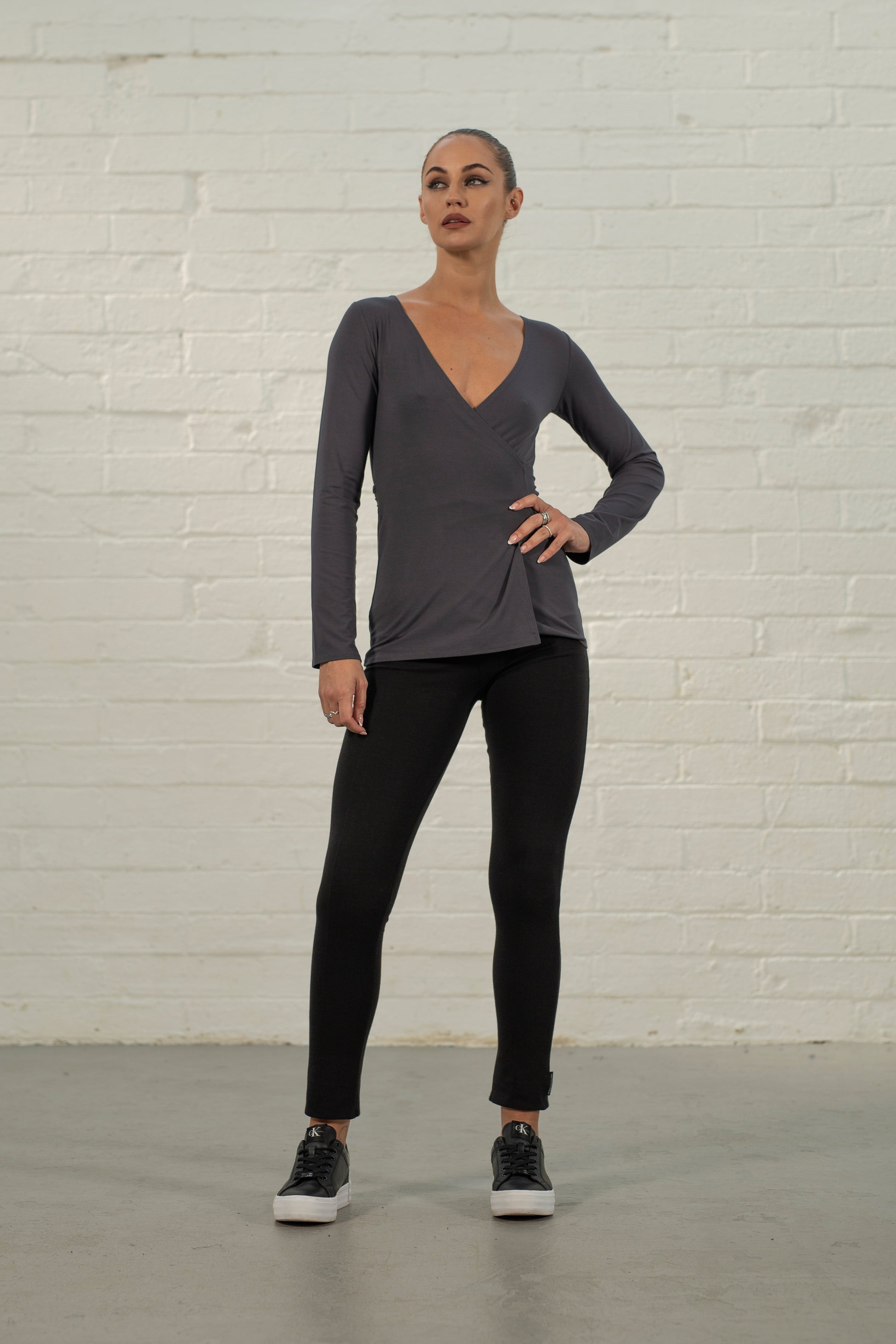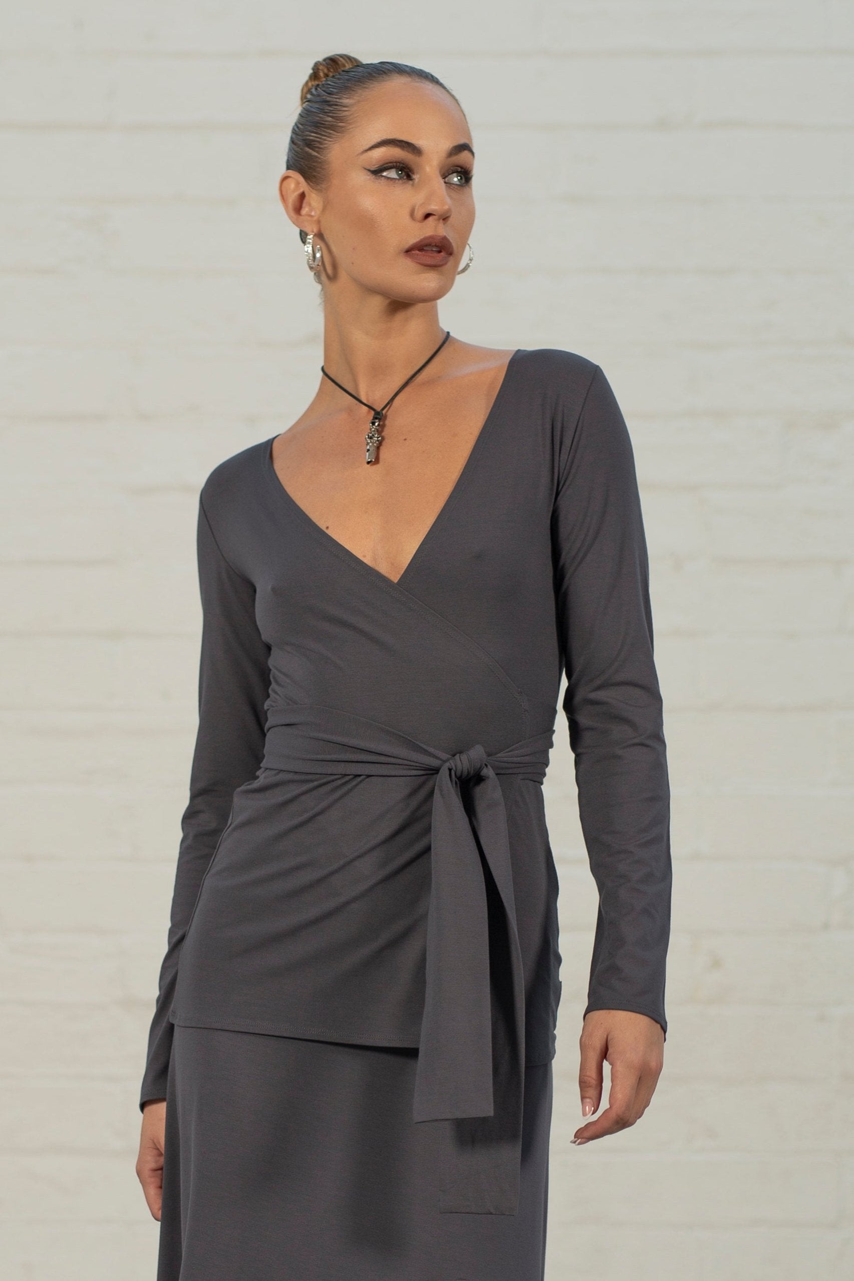 Originally named something else, the Morticia wrap top earned its name when we saw it in action during the photoshoot. Bring the attitude, ladies—this top is made for making a statement. Crafted in our Fabric 2 jersey, it has a snug, fitted shape with a deep V-neck when worn on its own. You can tie it at the back or wrap the long ties around and knot them at the side for a chic detail.