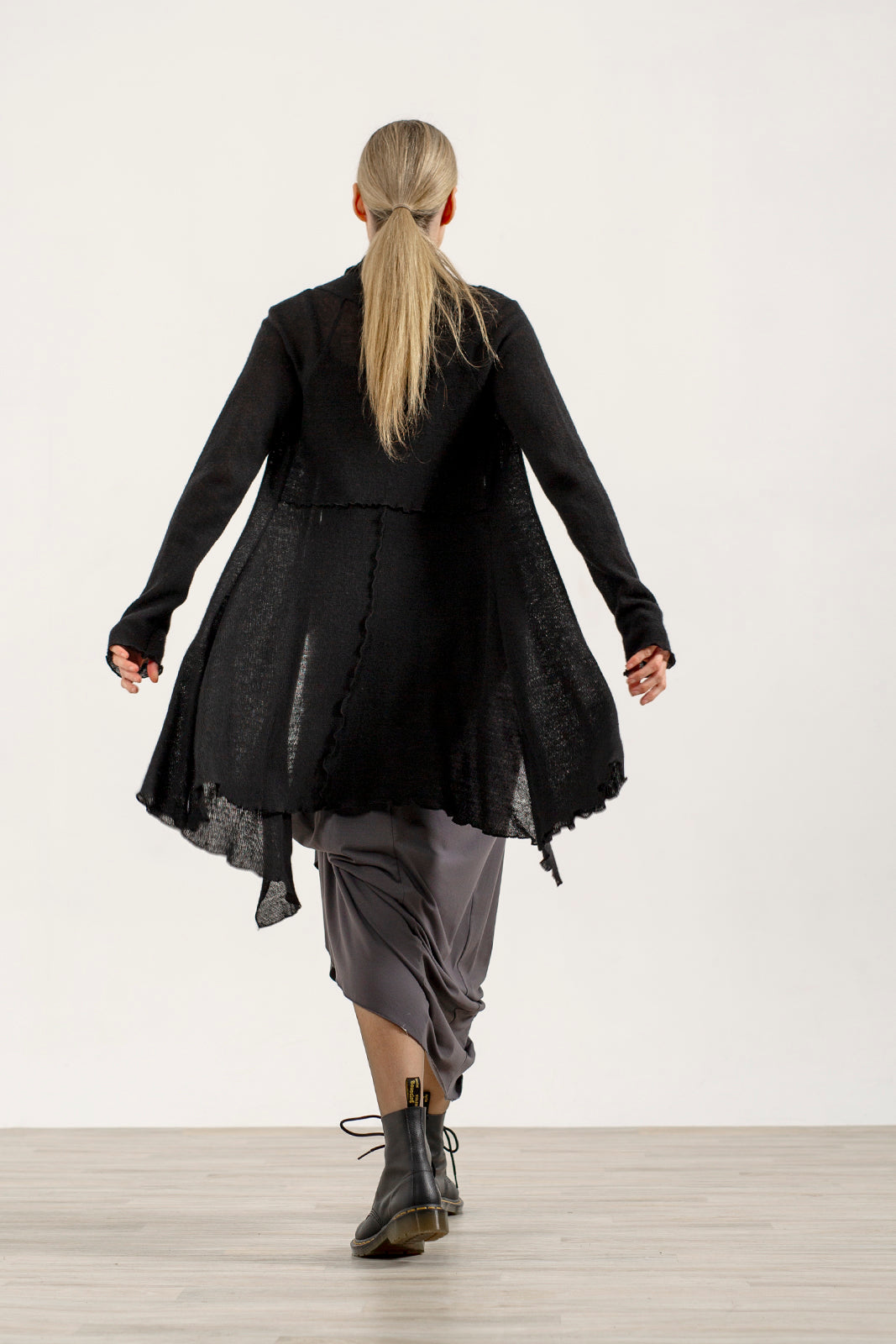 Paris is your go-to lightweight layer — soft, floaty, and effortlessly elegant. Made from a beautiful wool mix, she wraps you in warmth without the bulk. The grown-on neckline folds into soft drapes that fall naturally around the collarbone and into a fluid, asymmetrical hem. With a soft fitted sleeve and delicate baby lock finish, Paris adds just the right amount of softness and shape to your outfit.