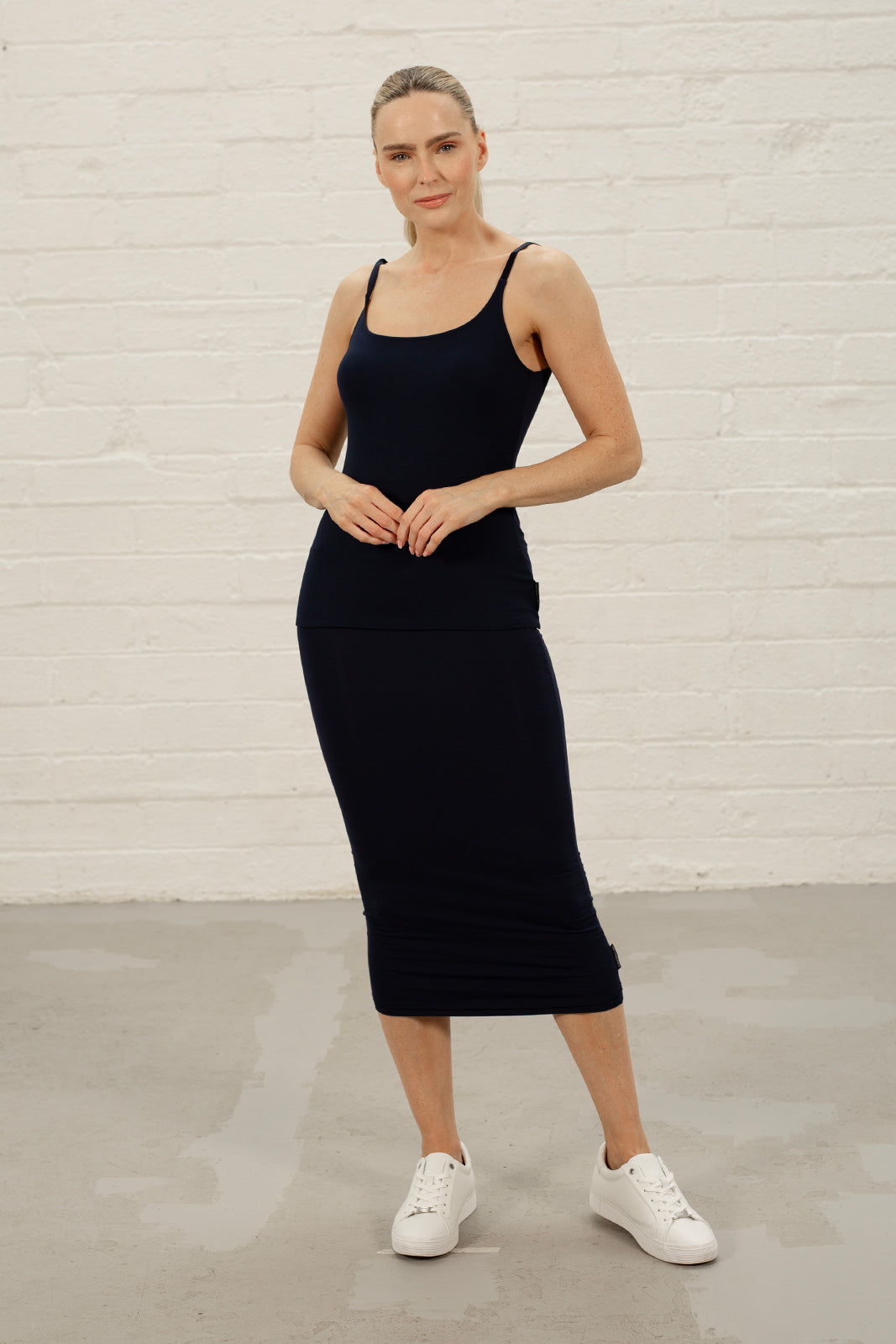 The Kira is our recent addition to the MG basics - it's a mid-length strap top. Firstly, the length is cut to cover the bum, which makes it a perfect mate for leggings & jeans.
