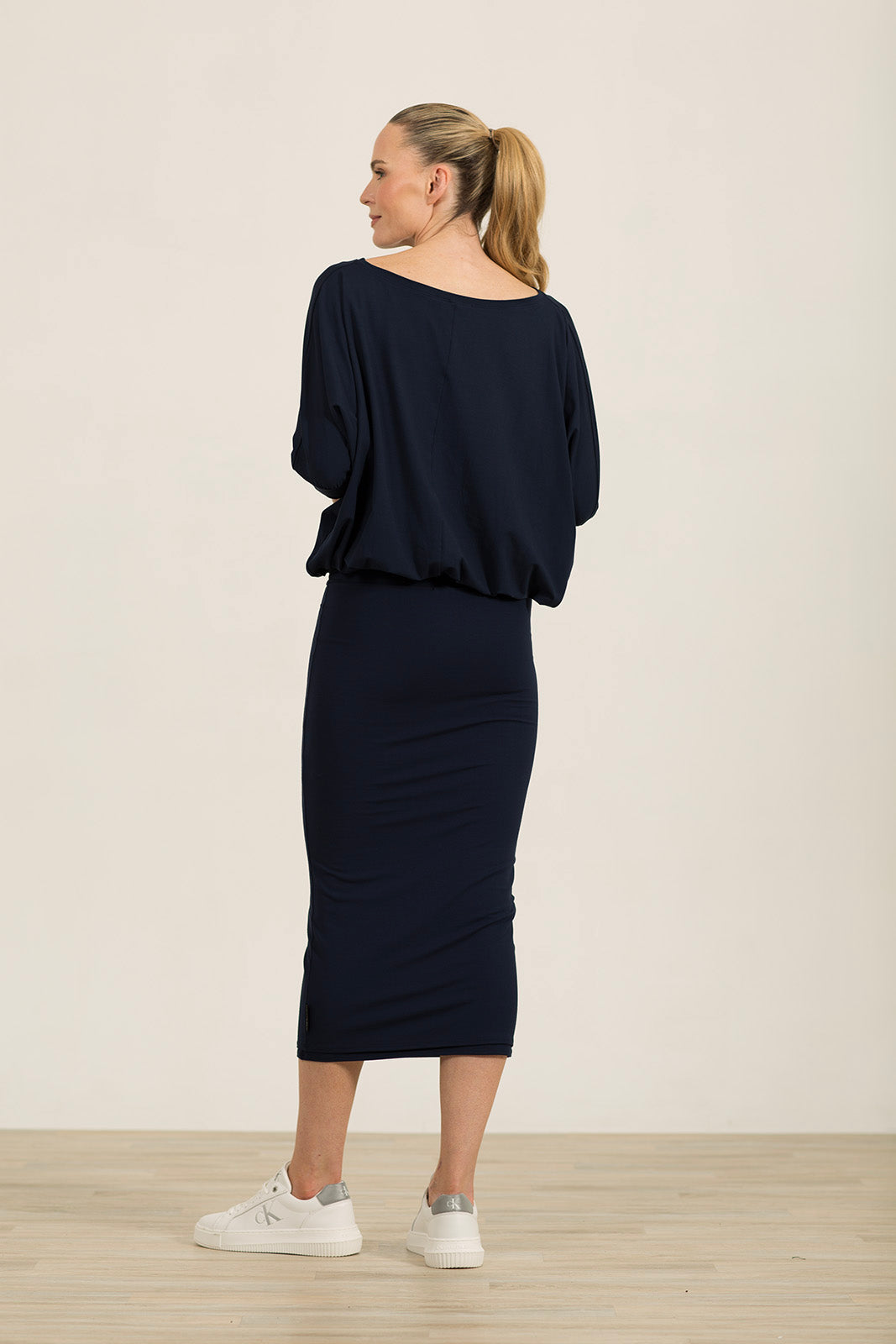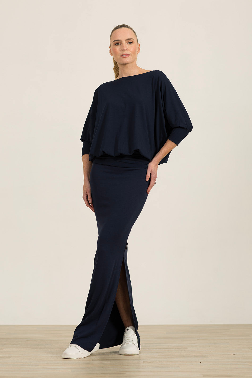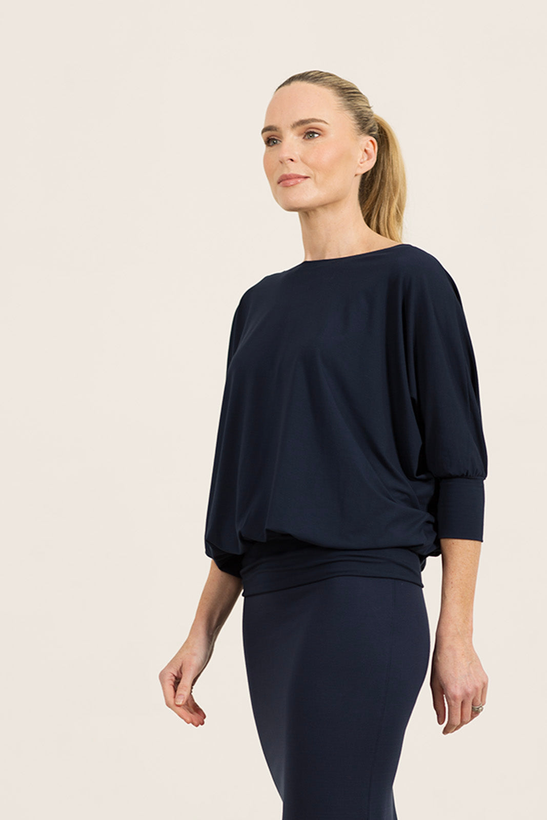 The bodice provides plenty of structure and coverage, crafted in our renowned jersey for durability and shape. It has a classic boat neck, perfect for showcasing your favourite jewellery, and the sleeves, which fall just below the elbow, gather into a neat cuff for a graceful finish.