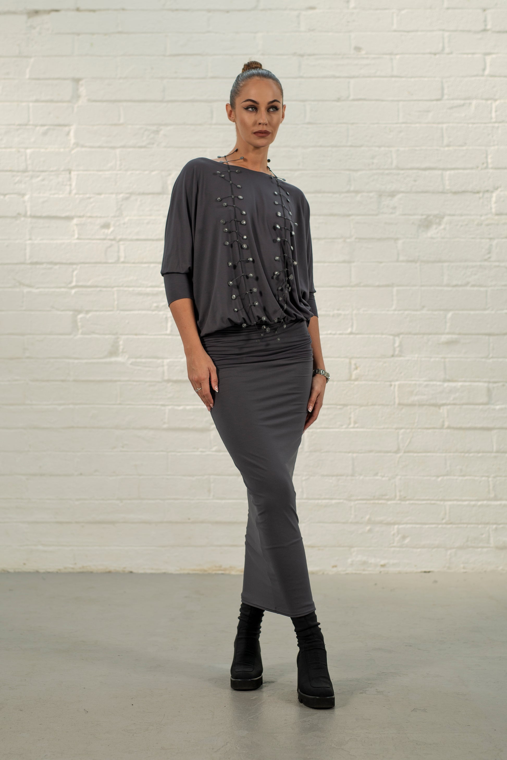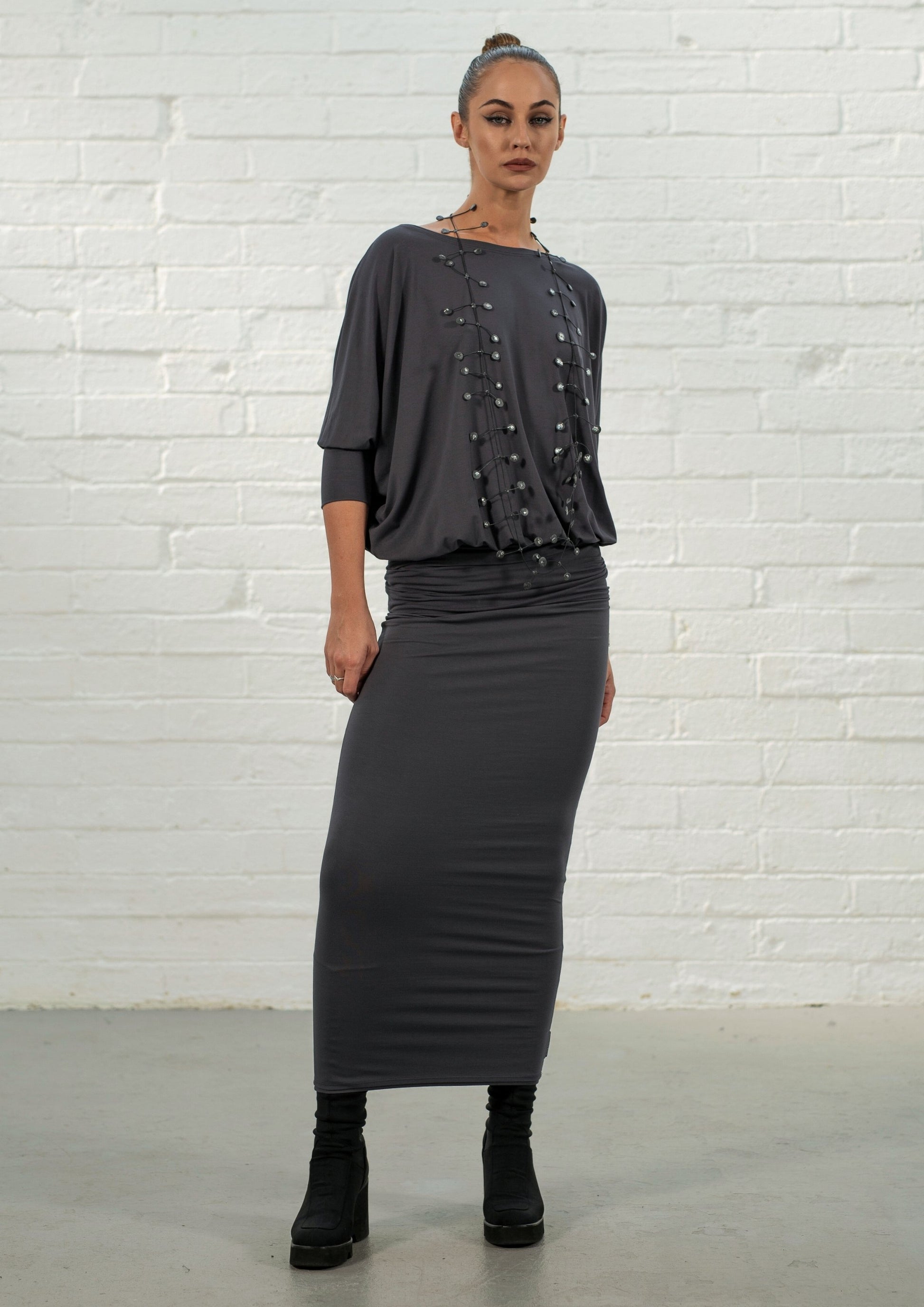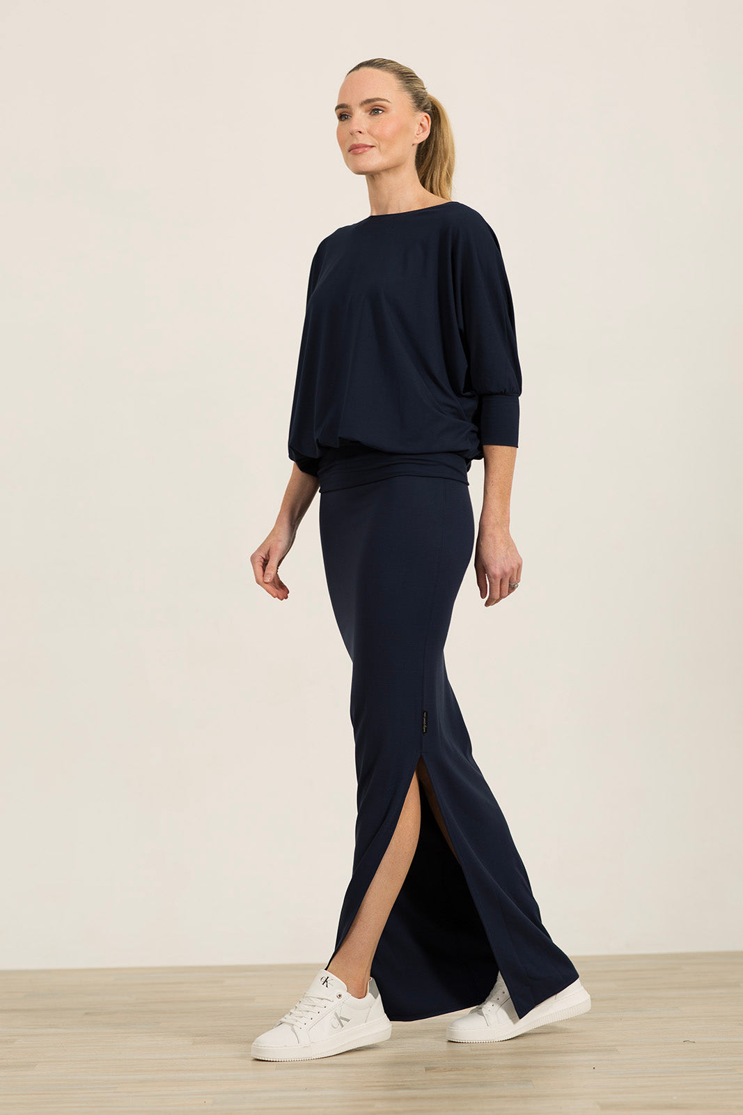 The bodice provides plenty of structure and coverage, crafted in our renowned jersey for durability and shape. It has a classic boat neck, perfect for showcasing your favourite jewellery, and the sleeves, which fall just below the elbow, gather into a neat cuff for a graceful finish.