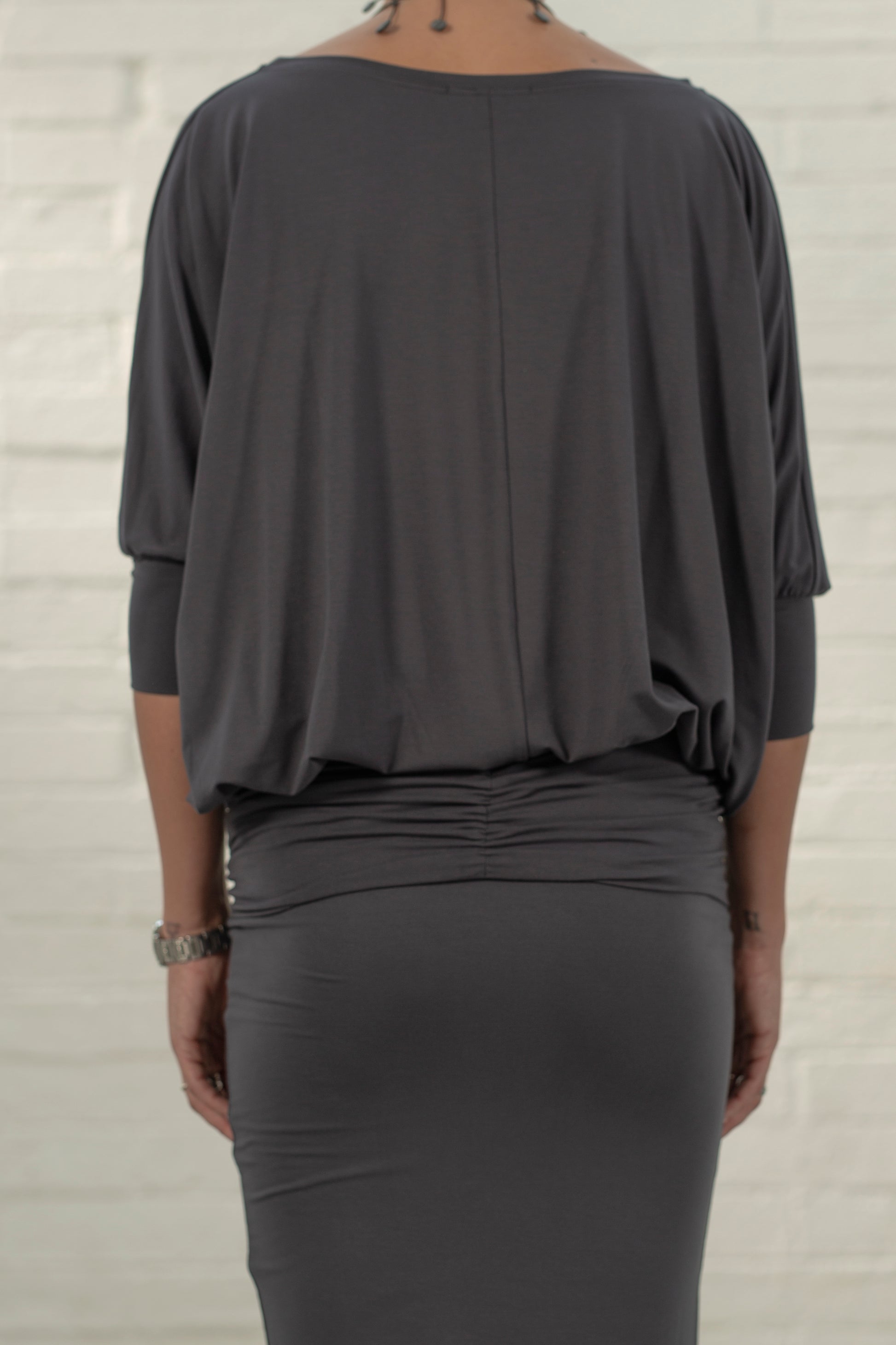 The Zeta is a versatile blouson style top, featuring a tight jersey band that’s ruched at the bum and across the hips, giving it a flattering, gathered effect. The band is designed to cover all your lady bits, making it perfect to pair with leggings, palazzos, or even a matching skirt to create a seamless one-piece dress look.